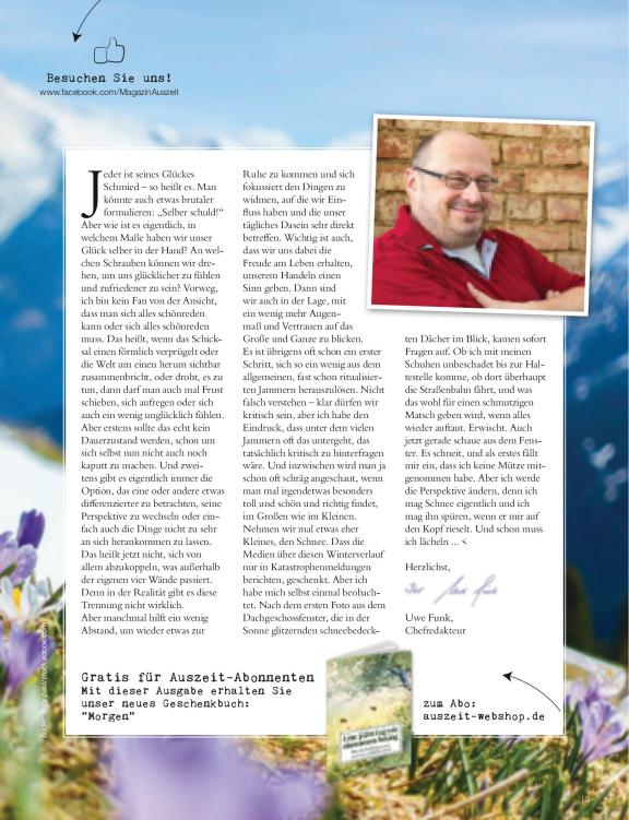 Das Magazin gibt Anregung und Inspiration auf dem Weg in die persönliche Balance und den Einklang mit der Natur. AUSZEIT verfolgt dabei einen ganzheitlichen Ansatz für Ausgewogenheit aus Ernährung, Spiritualität und Bewegung. Die Zeitschrift zur Horizonterweiterung und Inspiration liegt damit voll im aktuellen Trend und präsentiert Themen, die den Bogen vom „Natürlichen Wohnen“ über das „Natürliche Ernähren“ bis hin zum „Natürlichen Heilen und Entspannen“ schlagen. AUSZEIT zeigt sich dabei als Einheit aus ästhetischer Anmutung und hochwertigem Informationswert. Dem redaktionellen Anspruch wird die Zeitschrift mit gesellschaftlich relevanten Themen, spannenden Hintergrundartikeln, bildgewaltigen Reportagen sowie Dossier mit Wohlfühlcharakter für ein positives Lebensgefühl gerecht.