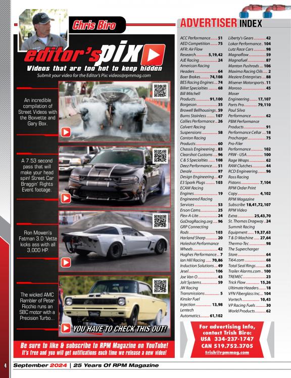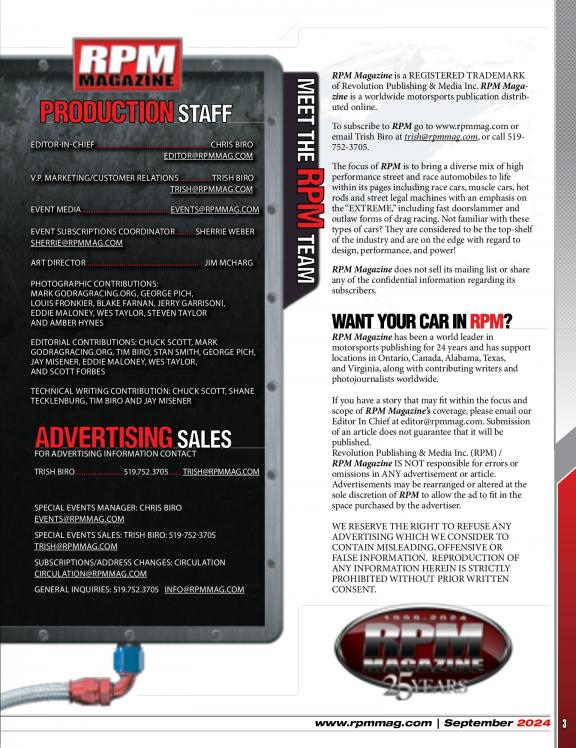 The focus of RPM is to bring a diverse mix of high performance street and race automobiles to life within its pages including: Race cars, musclecars, hot rods and street legal machines with an emphasis on the "Extreme" including Fast doorslammer and outlaw forms of Drag Racing. Not familiar with these types of cars? They are considered to be the top shelf of the industry and are on the edge with regards to design and power. Grab your copy today and check it out. We are sure you will want more!