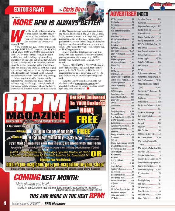 The focus of RPM is to bring a diverse mix of high performance street and race automobiles to life within its pages including: Race cars, musclecars, hot rods and street legal machines with an emphasis on the "Extreme" including Fast doorslammer and outlaw forms of Drag Racing. Not familiar with these types of cars? They are considered to be the top shelf of the industry and are on the edge with regards to design and power. Grab your copy today and check it out. We are sure you will want more!